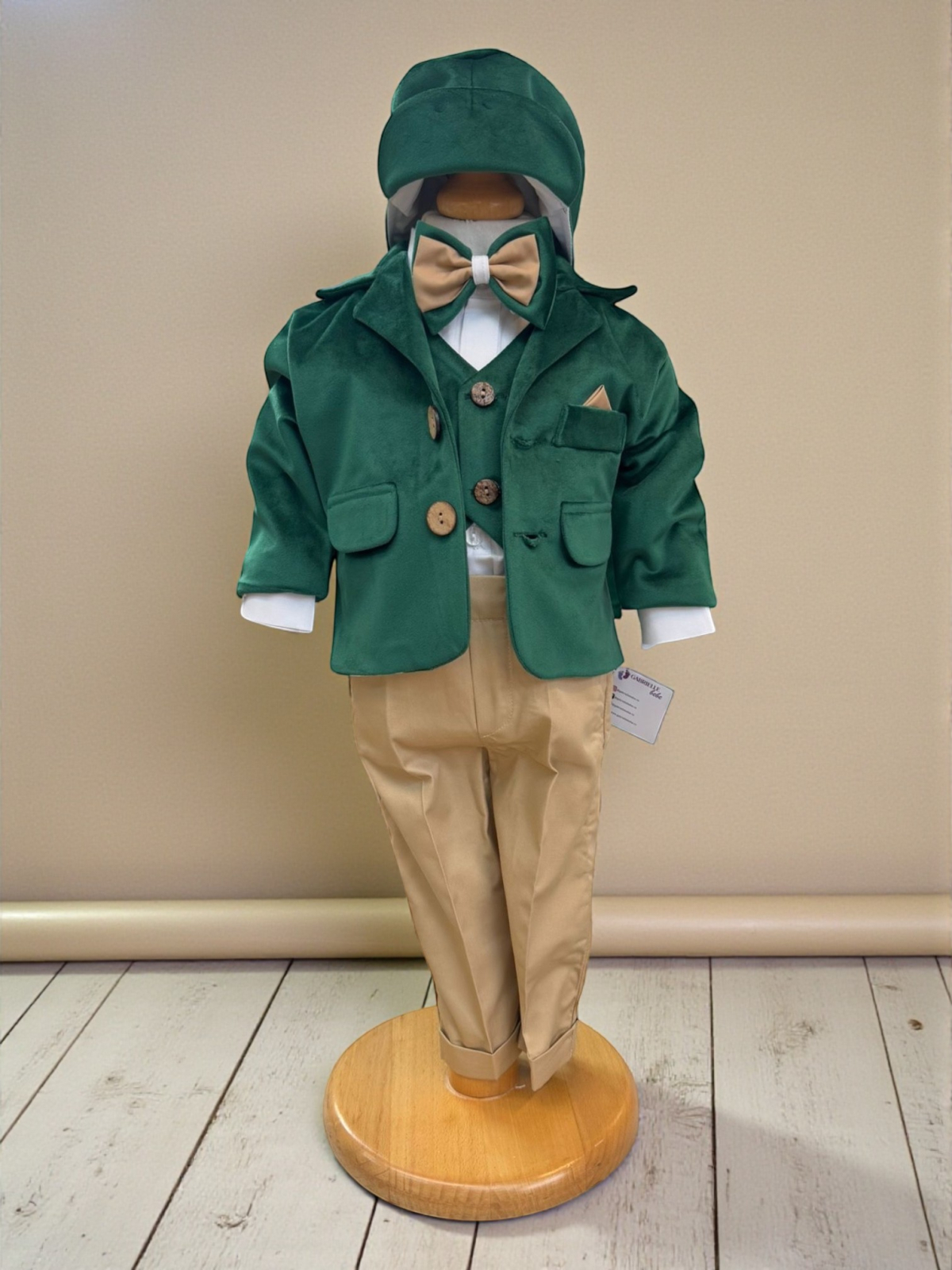 Acest set complet, care include cămașă, pantaloni, șepcuță și papion, oferă un look clasic și festiv. Catifeaua verde, cu textura sa moale și delicată, este perfectă pentru pielea sensibilă a bebelușului și va transforma botezul într-un moment memorabil.